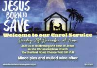 5:00pm → 6:00pm Carol Service – celebrating the true meaning of Christmas with Bible readings, carols and songs. Refreshments after the service.